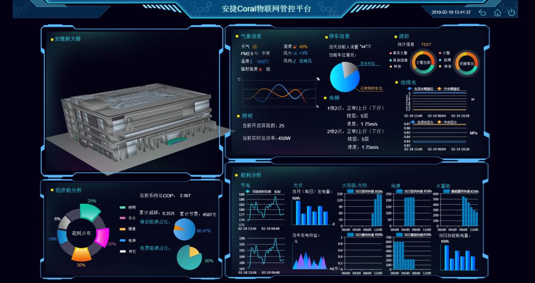 建筑模型信息系统(BIM)能够将各个建筑元素建立起内在的本身信息,并且整合建筑生命周期,使其能够改良规划、设计、建设、操作、和维护的流程之模型系统,并且能够充份的应用在营建工程上面。安捷物联能源互联网大厦便是借助于BIM技术的优势,在规划阶段进行了日照、风和热负荷等模拟,在基本方案的基础上进行BIM正向设计,同时以第二代物联网大数据管控Coral平台为核心,秉承“先节费,再节能”的运营原则,完成能源多项流转的实时监测、动态策略的下发调整,进而实现能源的最合理配给。