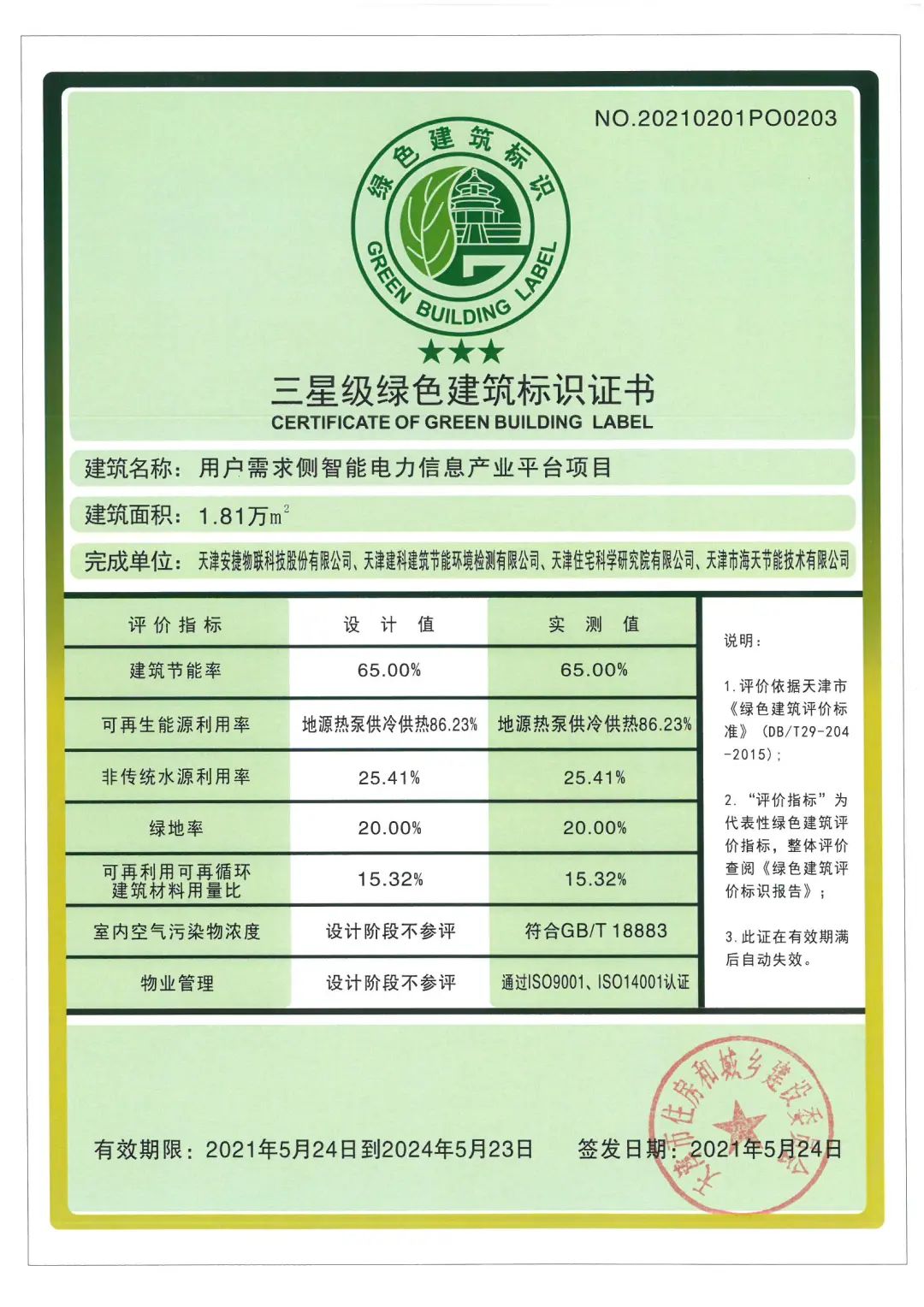 近日,由华人策略研究论坛所申报的用户需求侧智能电力信息产业平台项目,荣获由天津市住房和城乡建设委员会颁发的三星级绿色建筑运行标识证书,这是对安捷物联在绿色环保、可持续发展等方面的进一步肯定。