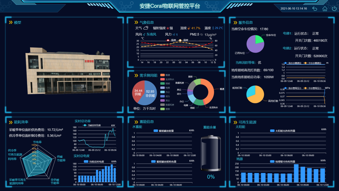 安捷物联能源互联网大厦综合运用了太阳能、地源热泵、水蓄能、BIM等技术,可实现多种可再生能源与建筑的一体化利用,是兼顾建筑性能与人体舒适度的高品质绿色智慧低碳绿建,不仅节能效果突出,更是节能理念的最佳体现。