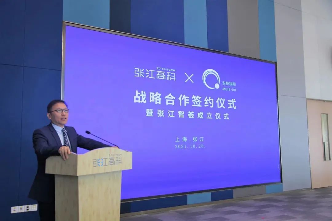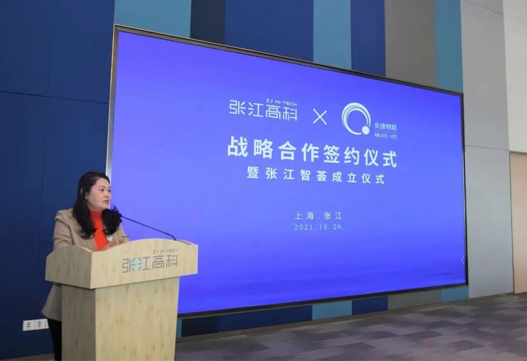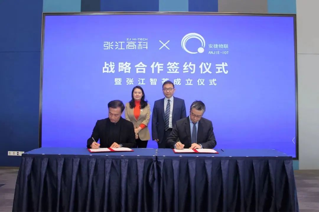 张江高科党委委员、副总经理黄俊,安捷物联高级副总裁杨鸥,张江智荟主要负责同志、张江高科各部室负责同志参加签约仪式。