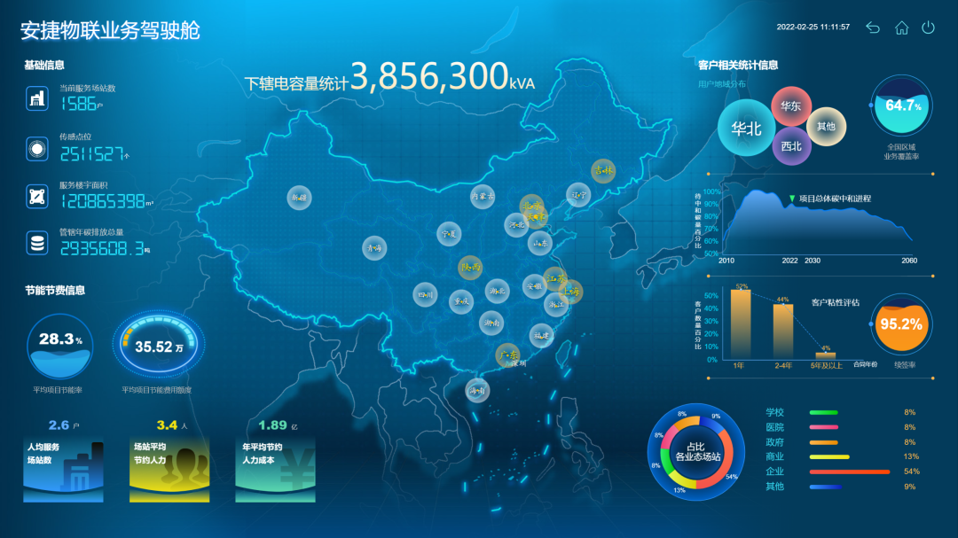 依托本成果,安捷物联成为国内首家通过BSI(英国标准协会)认证(基于PAS 2060:2014标准实现碳中和)的综合能源解决方案提供商,截至2021年10月,本成果已服务包括国家会展中心(天津)、西安曲江开发区、北京亦庄科技新城、北京大学等全国一千余家用户,覆盖大型公共建筑、商业地产、酒店、轨道交通等领域。应用楼宇面积超1亿平米,可学习、可分析、可预测、可决策,能够帮助用户将楼宇保持在最健康的状态,同时使楼宇内的用户体验达到最佳,可节约运行成本50%以上,节省系统维护费用20%以上,降低能耗15%以上,降低碳排放超百万吨。