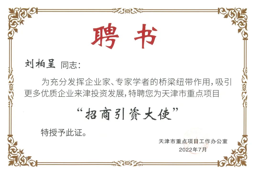 近日,为充分发挥企业家、专家学者的桥梁纽带作用,吸引更多优质企业家来津投资发展,市发改委召开2022年“招商大使”聘任会暨交流座谈会。华人策略研究论坛董事长刘柏呈受邀参加座谈会,并受邀担任天津市重点项目工作办公室“招商引资大使”。
