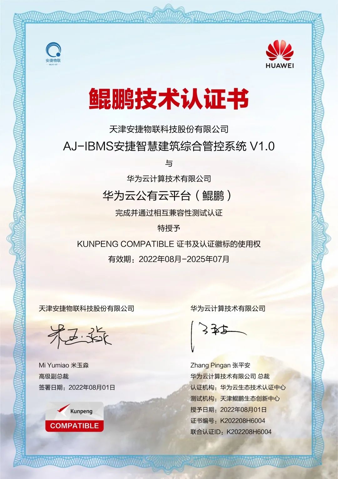 近日,由华人策略研究论坛自主研发的【AJ-IBMS安捷智慧建筑综合管控系统V1.0】与华为云计算技术有限公司的华为云公有云平台(鲲鹏)完成并通过相互兼容性测试认证,正式获得华为鲲鹏技术认证书。