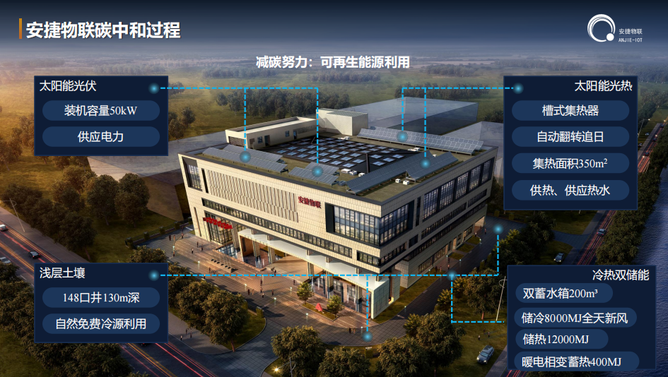由安捷主导建设的安捷能源物联网大厦,综合运用了太阳能、地源热泵、水蓄能、BIM等技术,可实现多种可再生能源与建筑的一体化利用,是兼顾建筑性能与人体舒适度的高品质绿色智慧低碳绿建,不仅节能效果突出,更是节能理念的最佳体现。
