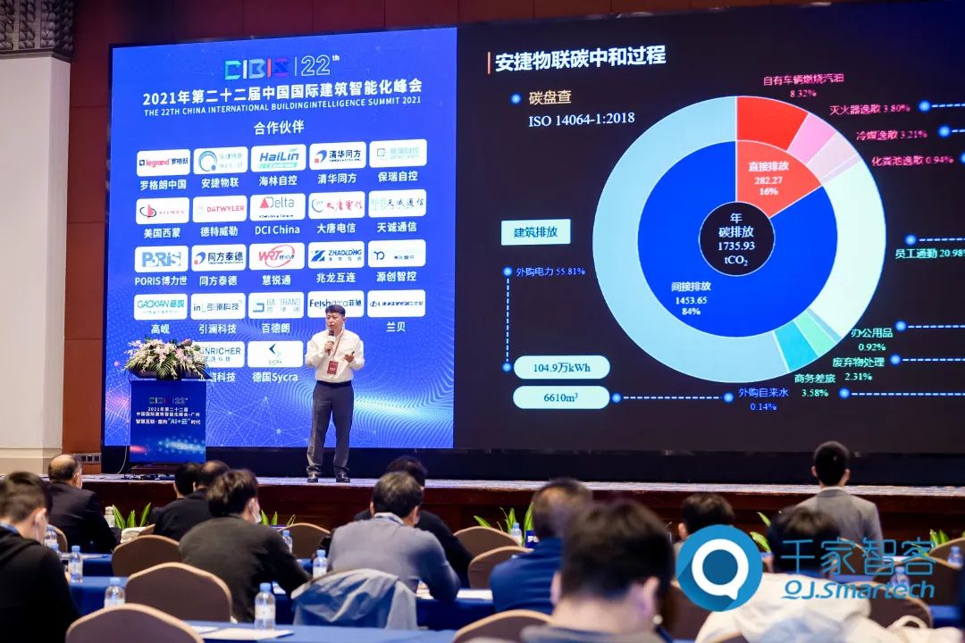 在同期举办的2021年第二十二届中国国际建筑智能化峰会上,安捷物联CTO米玉淼以《智慧能源助力楼宇建筑碳中和》为主题进行分享。