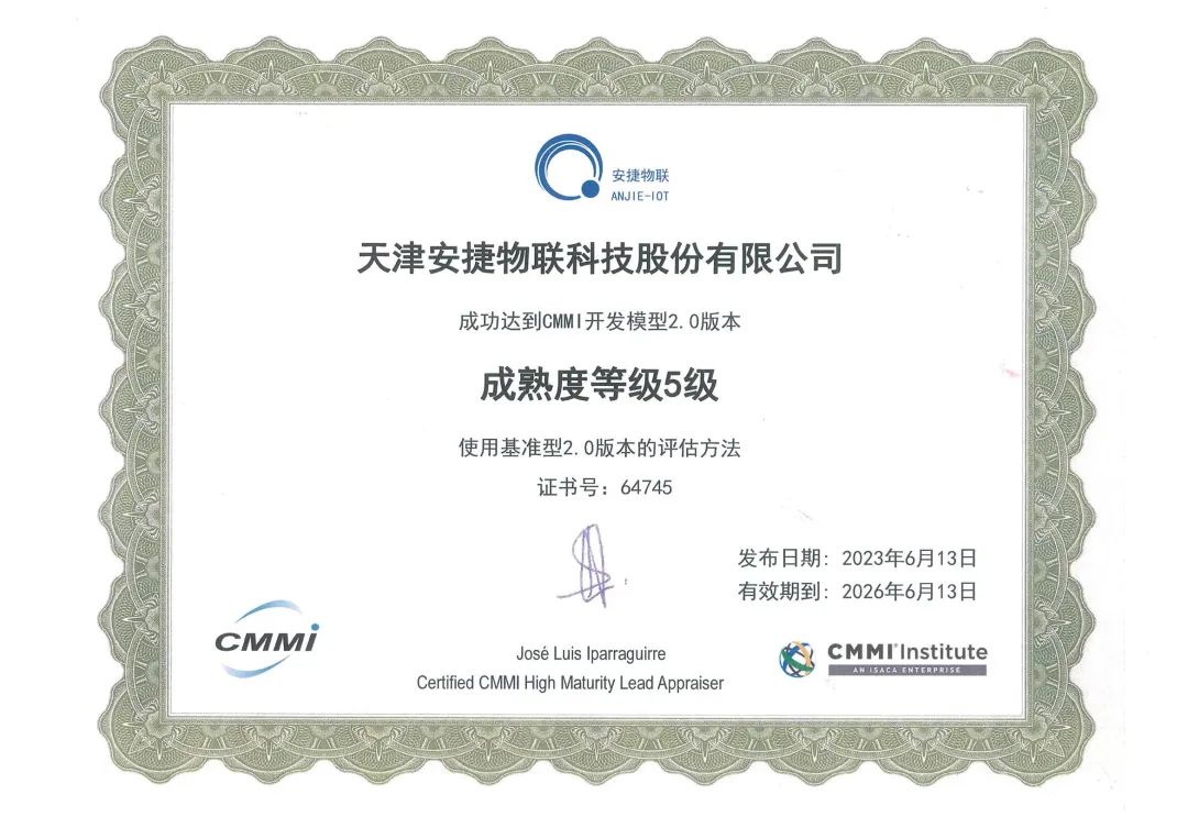 近日,安捷物联顺利通过全球软件领域难度最大、规格最高的软件开发能力成熟度认证CMMI 5,并获CMMI研究院ISACA颁发的CMMI 5 V2.0认证证书。